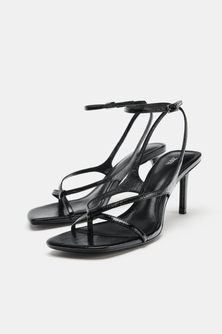 Leather sandals. Thin high heels. Front straps with toe loop. Ankle strap with buckle closure. Squared toe.