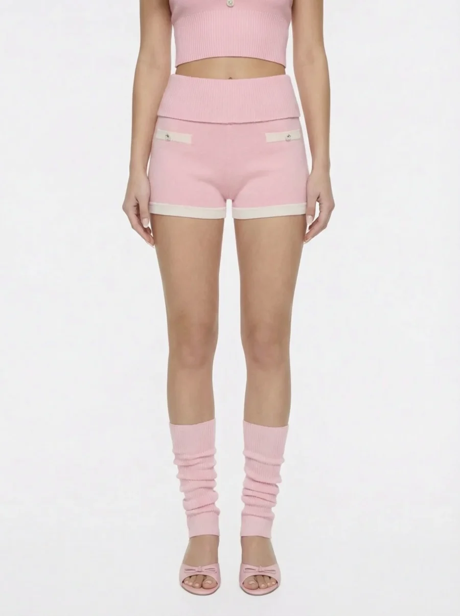 The Millie Knit Shorts in pink feel soft, relaxed, and quietly refined. The fold-over waistband sits smoothly at the waist, while ribbed trim at the hem keeps the silhouette clean and balanced. Subtle contrast details and decorative side pockets add polish without taking away from the ease of the design.