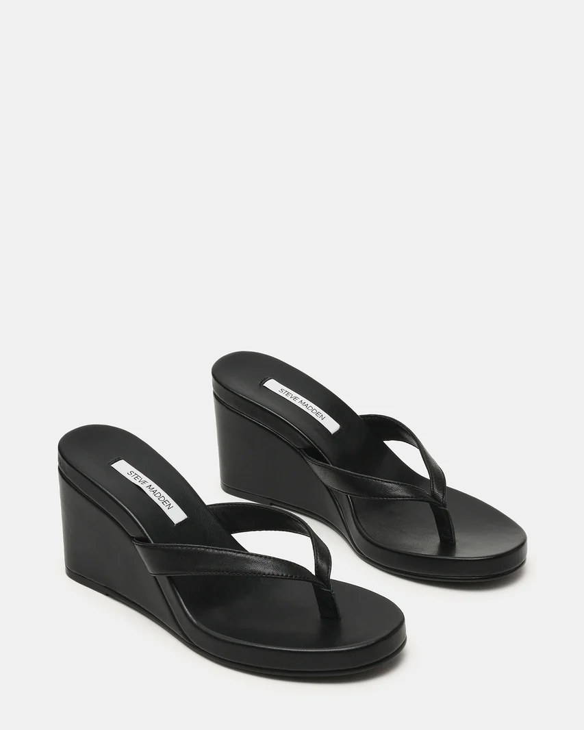 Elevate your summer wardrobe with the PLAYING BLACK LEATHER wedge sandal. Featuring a sleek thong design and a comfortable rounded toe, this mule-style sandal offers both style and ease. The wedge provides subtle lift and stability, making it perfect for all-day wear. This sandal combines sophistication with versatility for effortless pairing with casual or dressy outfits.